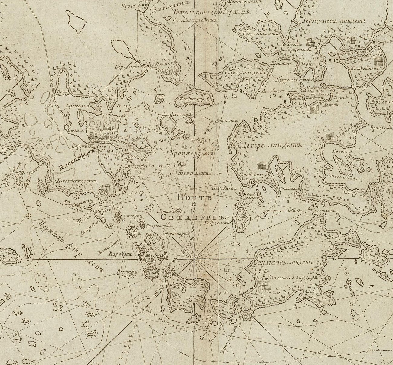 Tämä 1700-luvulta peräisin oleva merikartta näyttää Helsingin ympäristön ajalta, jolloin kaupunki oli vielä pieni rannikkopaikka mutta jo suurvaltojen tarkkailun kohteena. Kartta perustuu venäläisen kaleerilaivaston salaisiin mittauksiin – käytännössä vakoiluun.